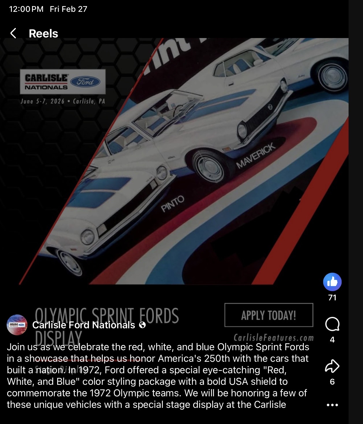 Registration for the special Carlisle PA all Ford Nationals ends March 25th. The show is June 5-7. I’ve been to the show about two dozen times and had my 2nd Sprint convertible in building T on display one time. I attended the very first show and 1995 with my 72 Mach1 and I’m not sure if I can bring my 3rd convertible as I am 2,200 miles away living in Arizona but I hope to be there in person to see some nice 1972 Sprints.